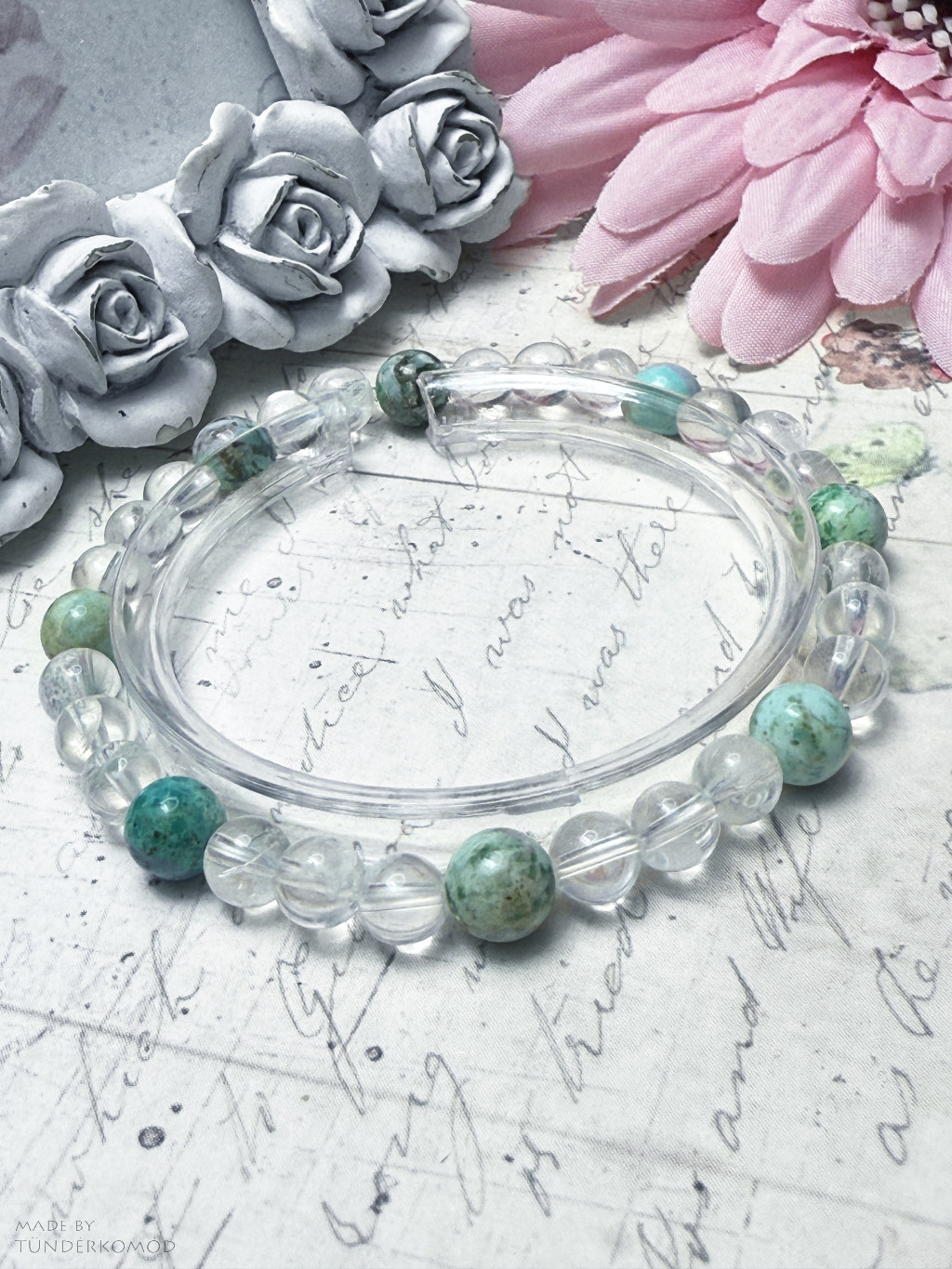 Ez a karkötő nem való mindenkinek! Csak azoknak, akiknek elege van abból, hogy lenyeljék a szavakat, és elhallgassák, ami belül feszíti őket. A perui türkiz (ami valójában a krizokolla egyik varázslatos fajtája) a szív és a torok kapuját nyitja meg: segít kimondani az igazságot, még akkor is, ha remeg a hangod. A hegyikristály ehhez adja a tisztaságot és az erőt – megtisztítja a körülötted és benned lévő zajt, felerősíti a bátorságot, és emlékeztet arra, hogy legbelül mindig pontosan tudod, mi a helyes. Ez a párosítás ősidők óta kíséri azokat, akik az igazságot és a belső békét keresik.
