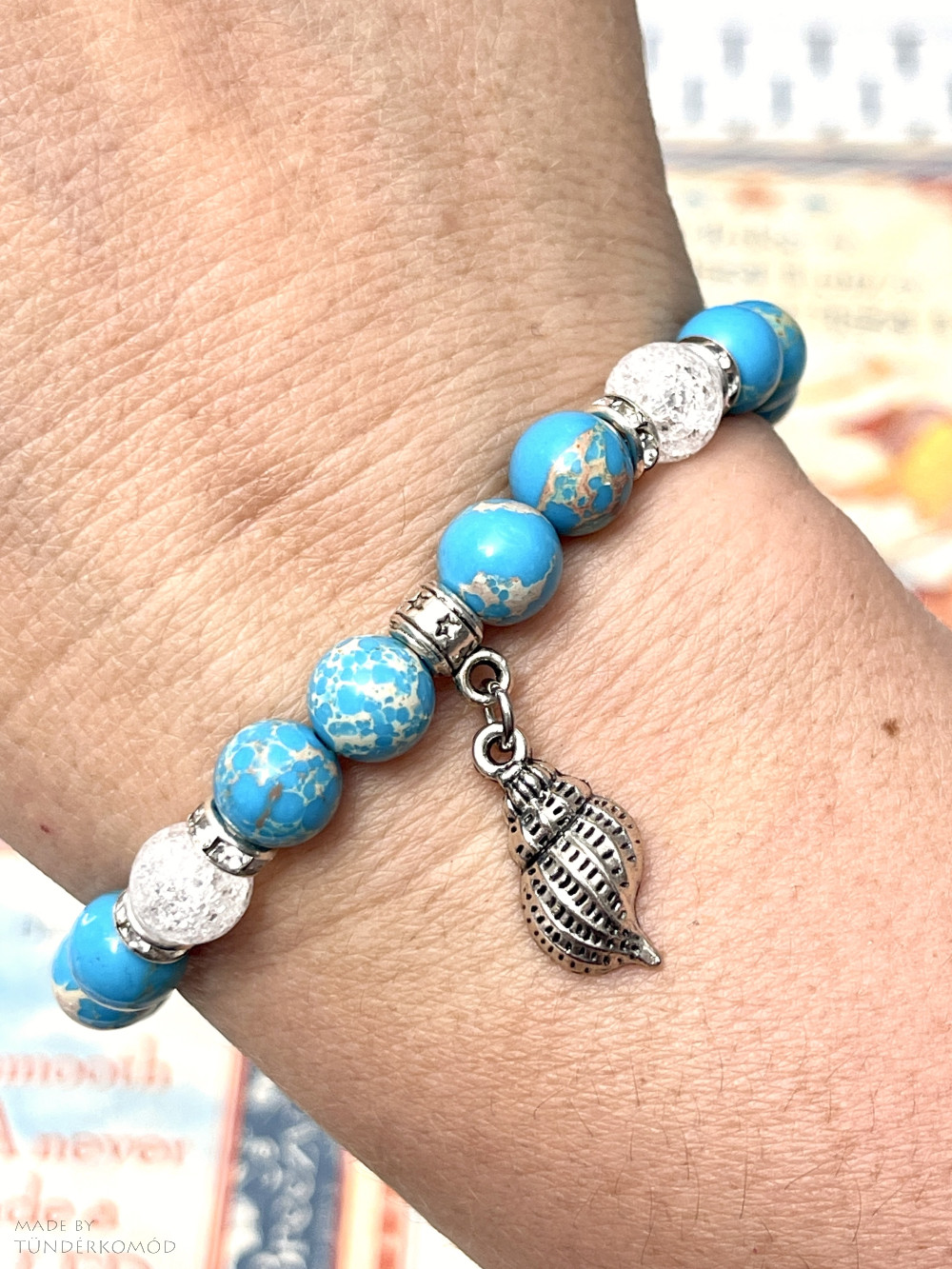 Ez a karkötő egy kicsike darabot hoz el neked ebből a tengerparti paradicsomból, felidézve minden kellemes emlékét. A kék regalitjáspis színe a tenger vízét tükrözi vissza, a roppantott hegyikristály a hullámok pajkos játékát idézi, a csigaház pedig egy apró ajándék a tengertől, hogy mindig érezd magadon a nyári napok és remény melegét.
