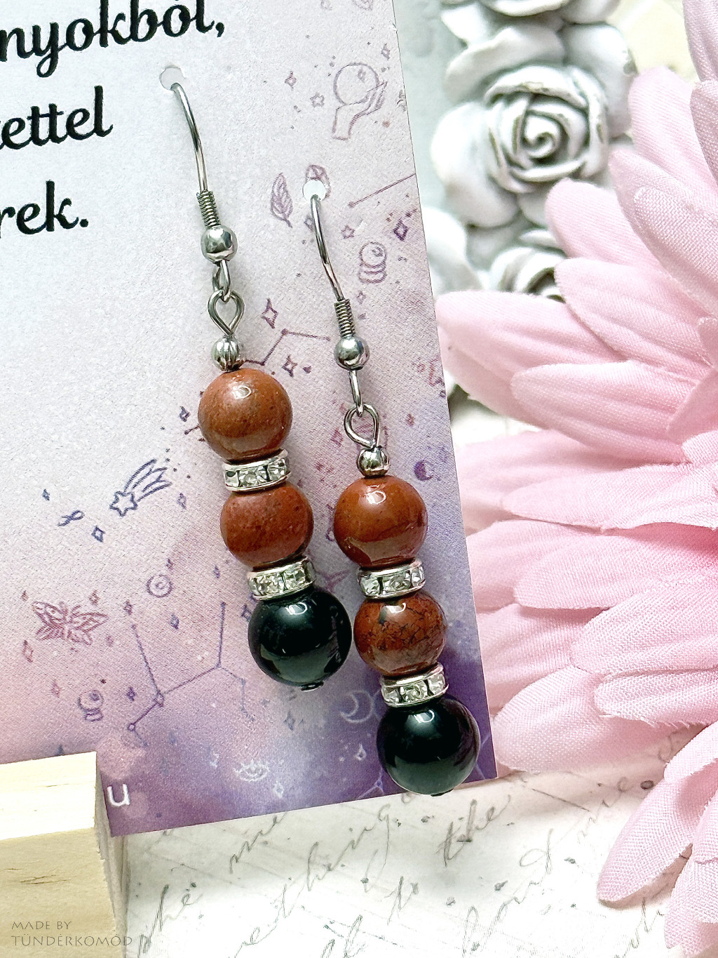 A vörös jáspis tüzes ereje és az ónix mély fénye különleges harmóniát alkot ebben a gyönyörű fülbevalóban: