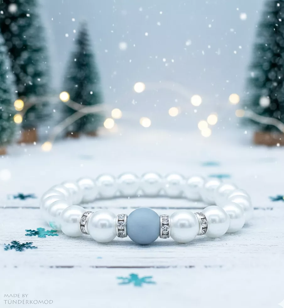 Ez a misztikus hangulatú karkötő az angyali világ szeretetteljes energiáját idézi meg. A világoskék angelit nyugtató, angyalhívó rezgéseit kiegészíti a teklagyöngy visszafogott fénye, amely lágy, harmonikus hatást ad az ékszernek.